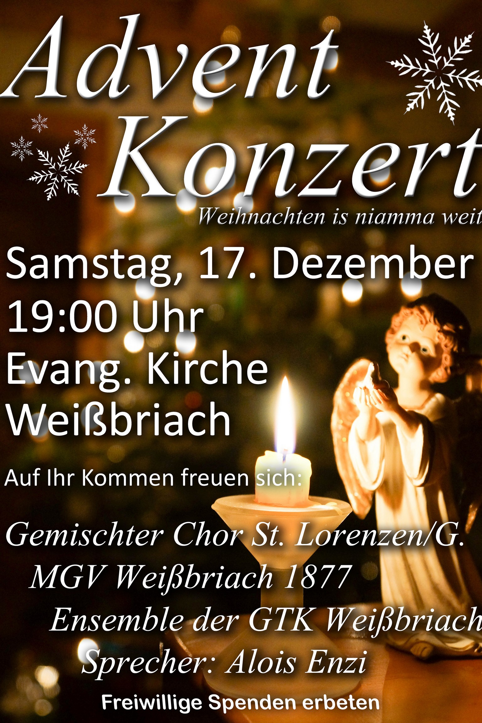 Gemeinsam mit dem gemischten Chor St. Lorenzen im Gitschtal veranstaltet der MGV Weißbriach 1877 ein Adventkonzert unter dem Titel „Weihnachten is niamma weit“ am Samstag, 17. Dezember 2022, um 19 Uhr in der evang. Kirche in Weißbriach.