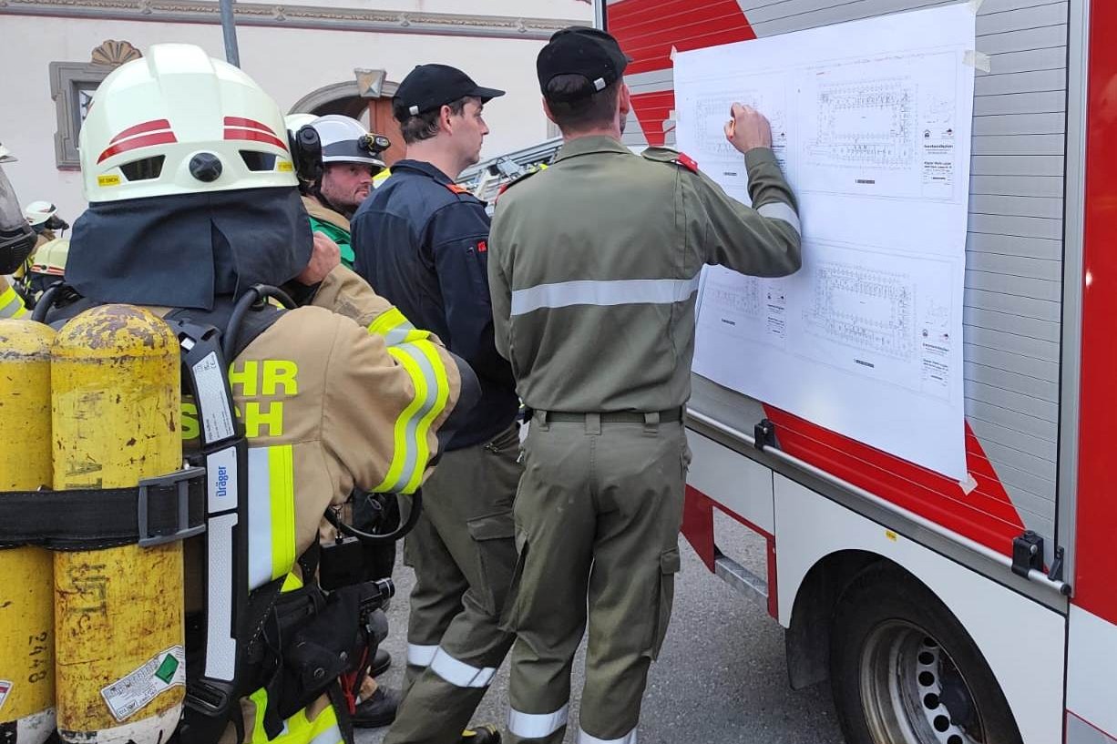 Insgesamt übten acht Atemschutztrupps in dem historischen Gebäude. Unterstützt wurde der Übungseinsatz von der Drehleiter der FF Sillian und von der mobilen Atemluftflaschen-Füllstation der FF Kötschach-Mauthen.