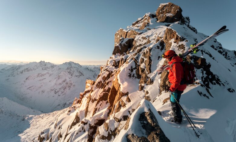 Adrenalin-Erlebnis Freeriden: Ein Berg, ein Mensch, Schnee, Skier und Abfahrt.