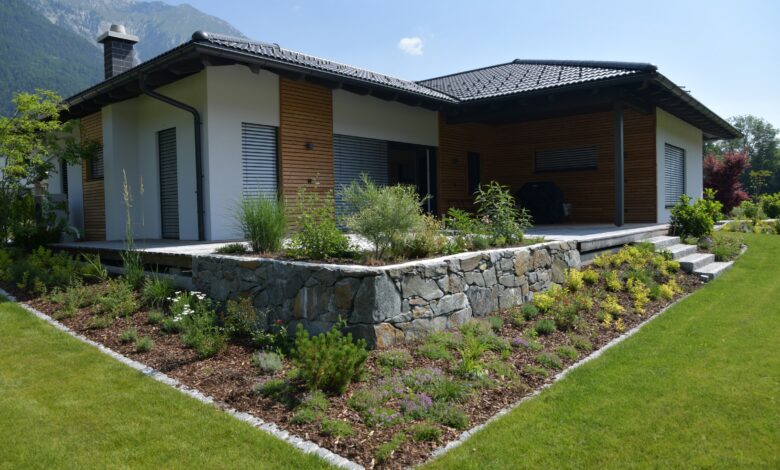 Eine terrassenumrahmende Hochbeet-Führung mit Natur-Steinmauer-Umrandung geben dem Gartengrundstück eine schlichte und elegante Struktur.
