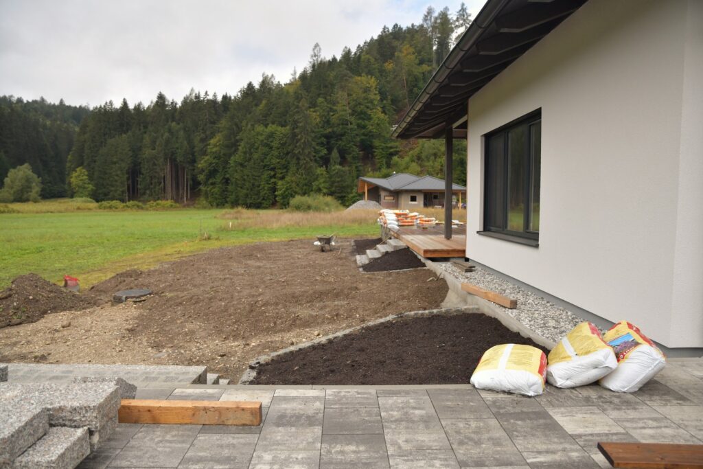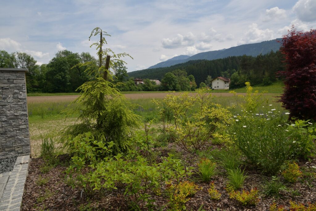 Die Eheleute wünschten sich seit 2017 einen Zweitwohnsitz in Kärnten. Schlussendlich erfüllten sie sich diesen langjährigen Wunsch mit dem Kauf eines Baugrundstückes in Untervellach bei Hermagor. Dort sollte rund um den Neubau ein grüner, wenig, gießintensiver, pflegeleichter, blühender, eleganter und charakteristischer Außenbereich entstehen.