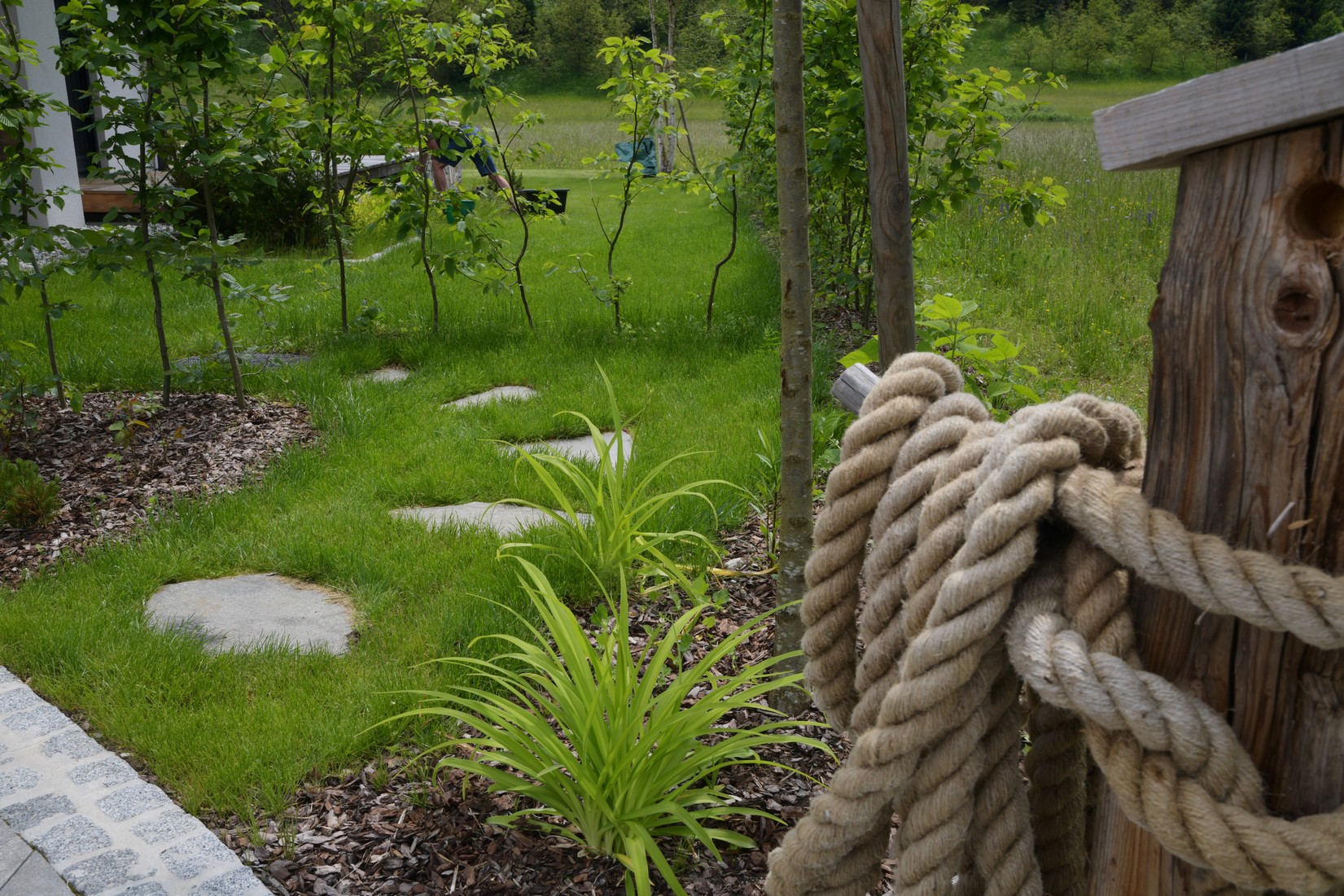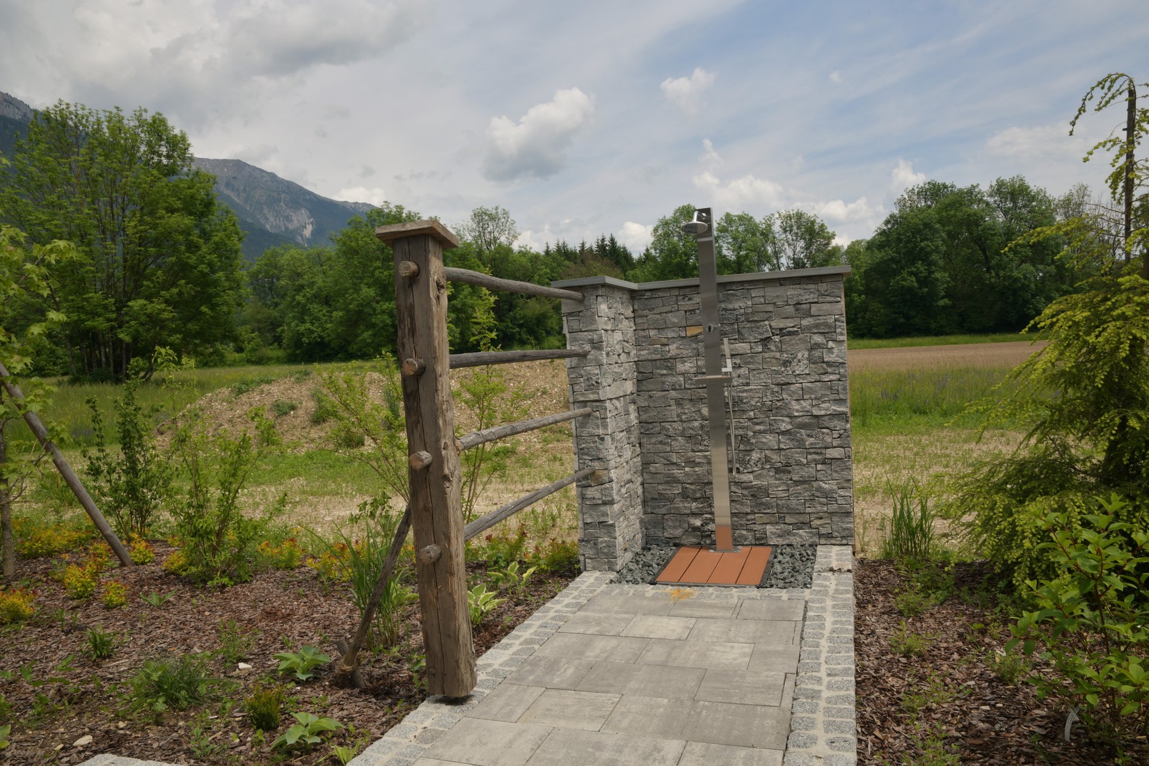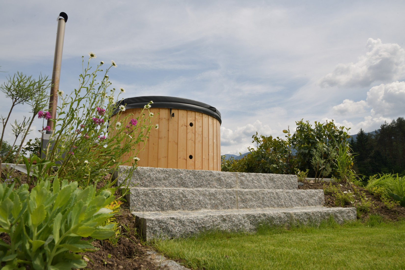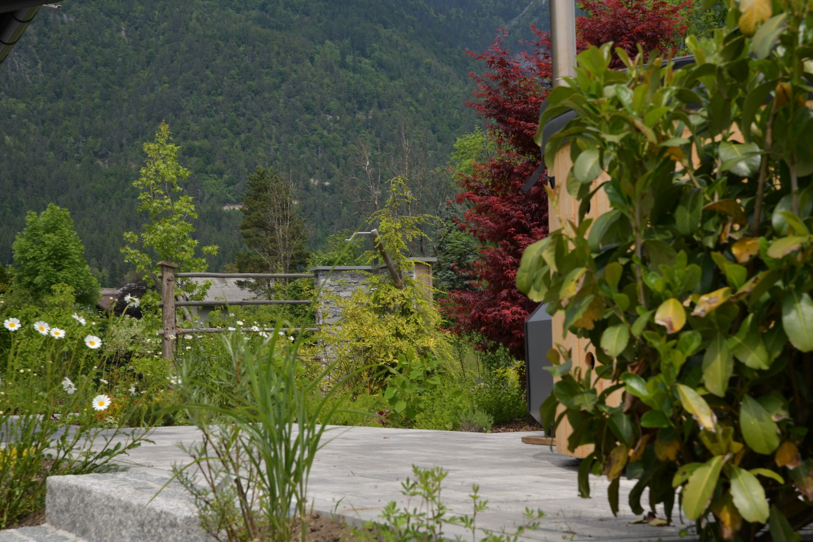 Der besondere Appell an Andreas Wieser lautete vor der Umsetzung: Die Aussicht auf die unverbaubare Naturlandschaft zu erhalten und trotzdem eine Abgrenzung und einen Sichtschutz zu den umliegenden Grundstücken zu schaffen. Weiter sollte der Garten über eine gewisse Selbstständigkeit verfügen, denn er müsse aufgrund des deutschen Wohnsitzes auch einige Tage bis Wochen ohne die pflegenden Hände des Ehegespanns auskommen.