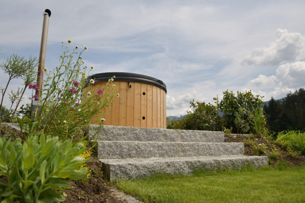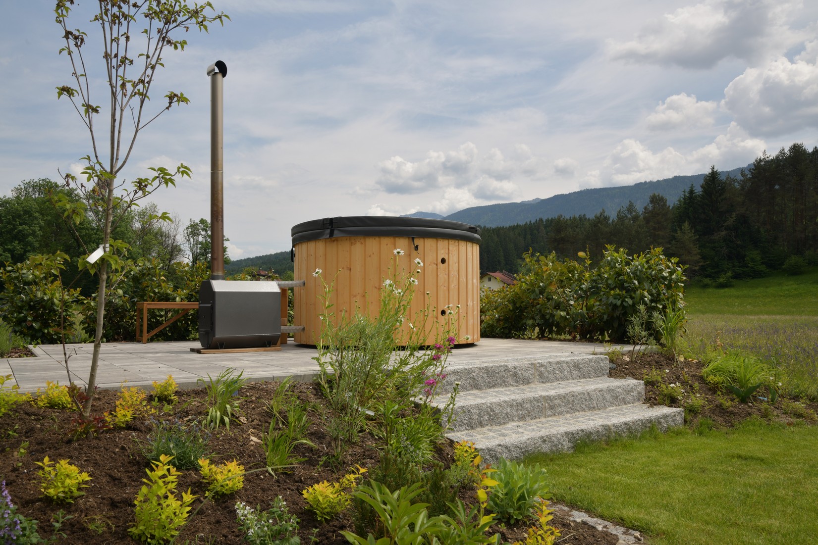 Von der Lärchenholz-Terrasse führt eine rutschfeste Granitstein-Treppe direkt zu den praktischen Hochbeeten, in denen duftendes Rosmarin-Kraut, gesunder Salbei und wertvolle Pfefferminze wachsen.