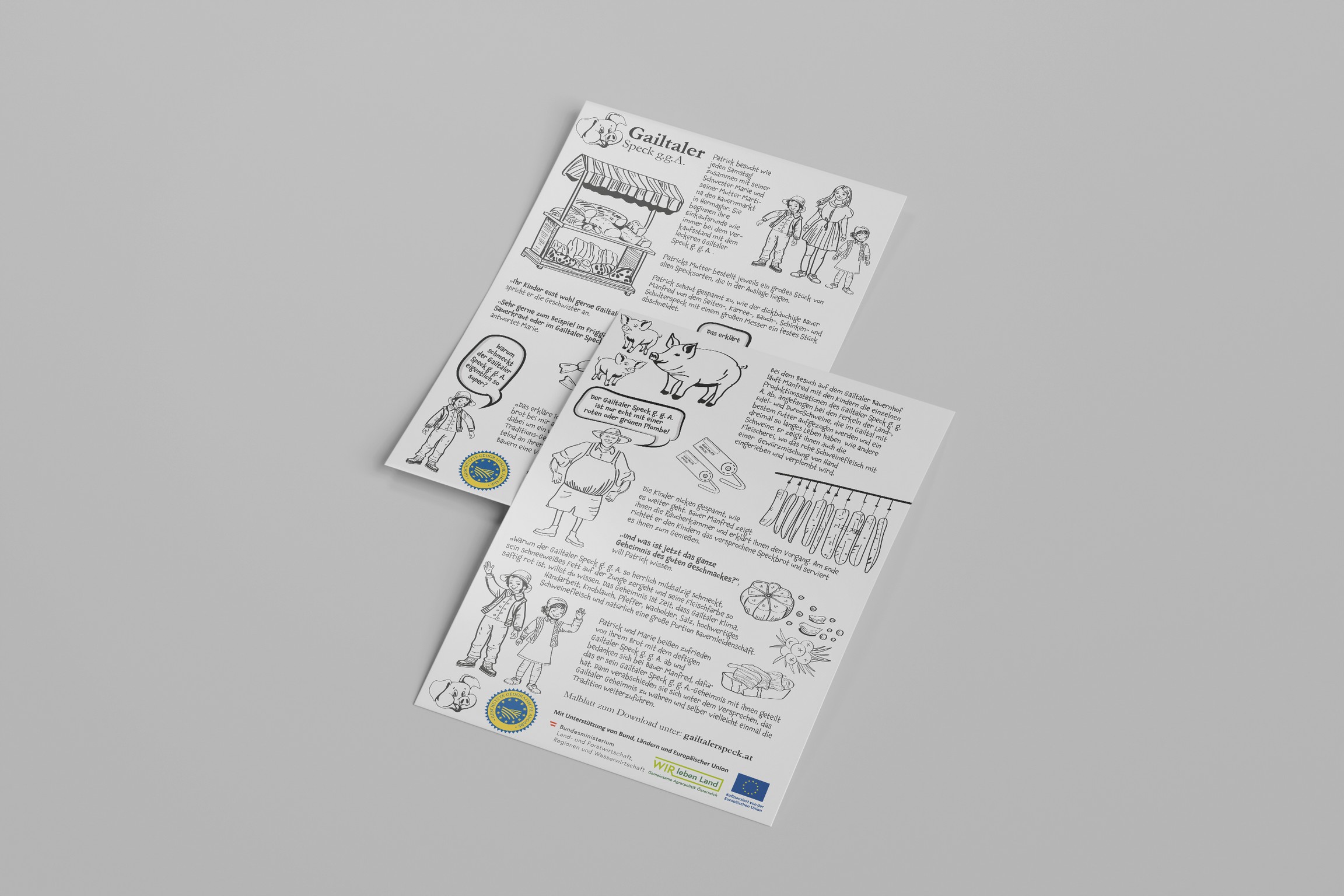 Weil der Gailtaler Speck g. g. A. sowohl Groß als auch Klein vorzüglich schmeckt, erzählt den Kleinen neuerdings ein Malblatt samt Geschichte Wissenswertes zur Herkunft, Herstellung und Tradition des Gailtaler Specks g.g.A.