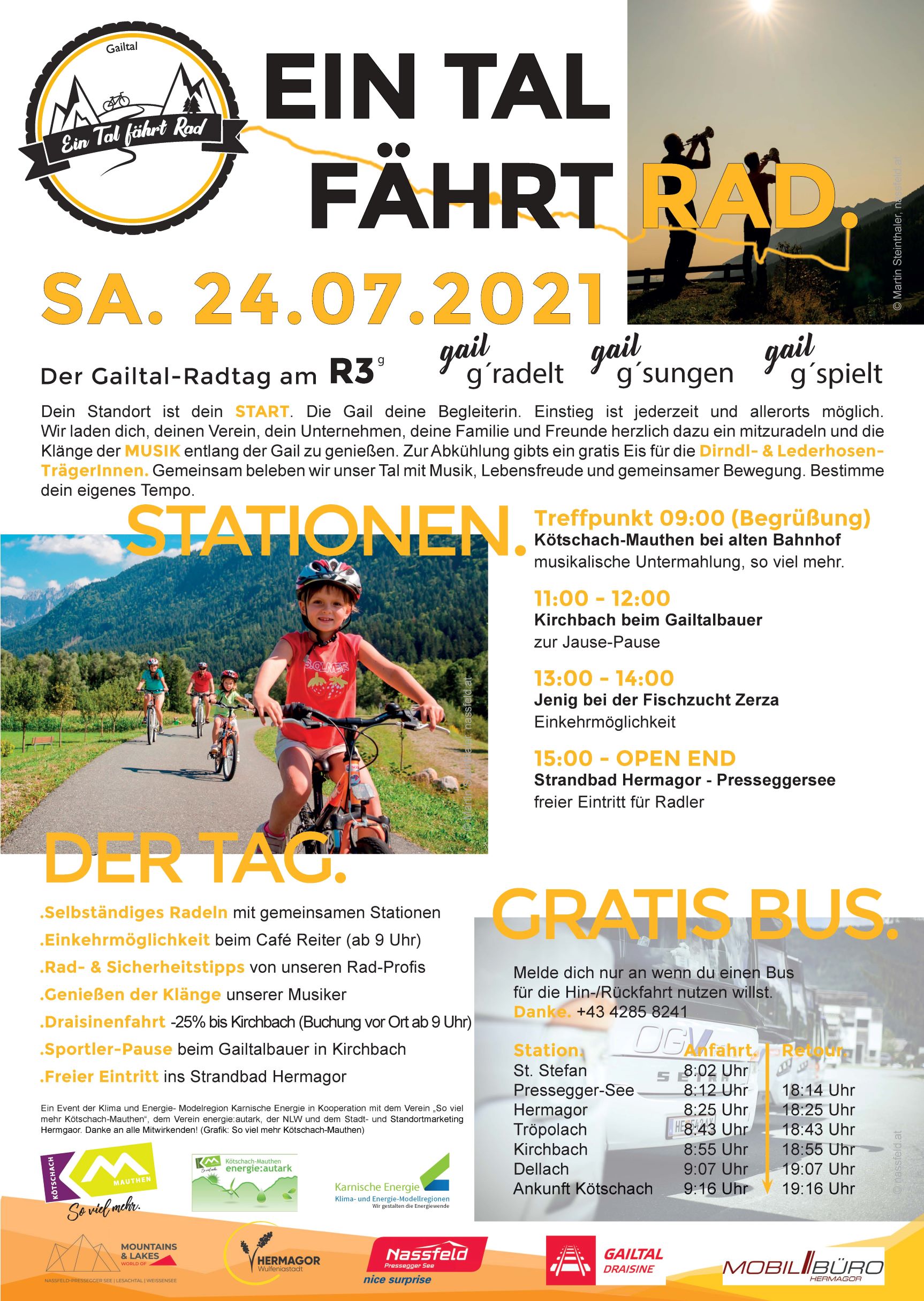 Dein Standort ist dein Start. Die Gail ist deine Begleiterin. Einstieg ist jederzeit und allerorts möglich. Wir laden dich, deinen Verein, dein Unternehmen, deine Familie und Freunde herzlich dazu ein mitzuradeln und die Klänge der Musik entlang der Gail zu genießen. Zur Abkühlung gibt’s ein gratis Eis für die Dirndl- & Lederhosen-TrägerInnen.