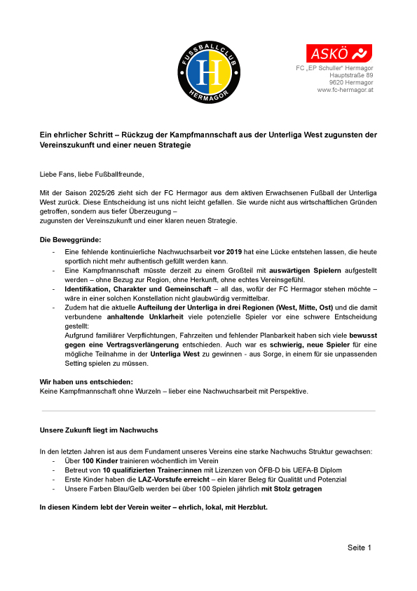 der FC Hermagor wird sich mit der kommenden Saison 2025/26 aus dem Erwachsenenfußball der Unterliga West zurückziehen. Dieser Schritt war nicht einfach – doch er ist durchdacht und voller Zukunft.