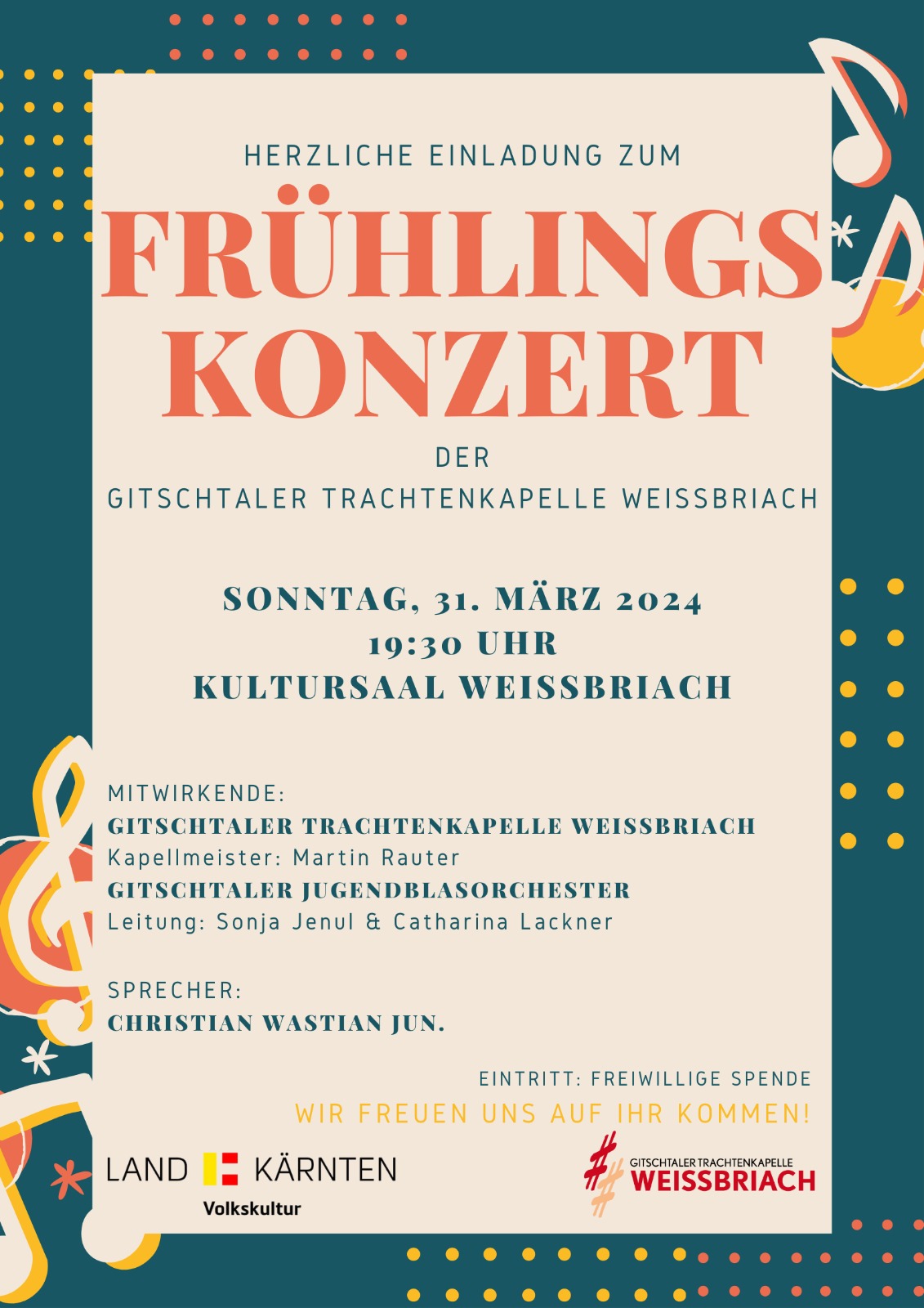 Eröffnen wird den Konzertabend unser Jugendblasorchester. Anschließend freut sich die Gitschtaler Trachtenkapelle Weißbriach, Dich mit einem abwechslungsreichen und schwungvollen Programm durch den Abend zu begleiten.