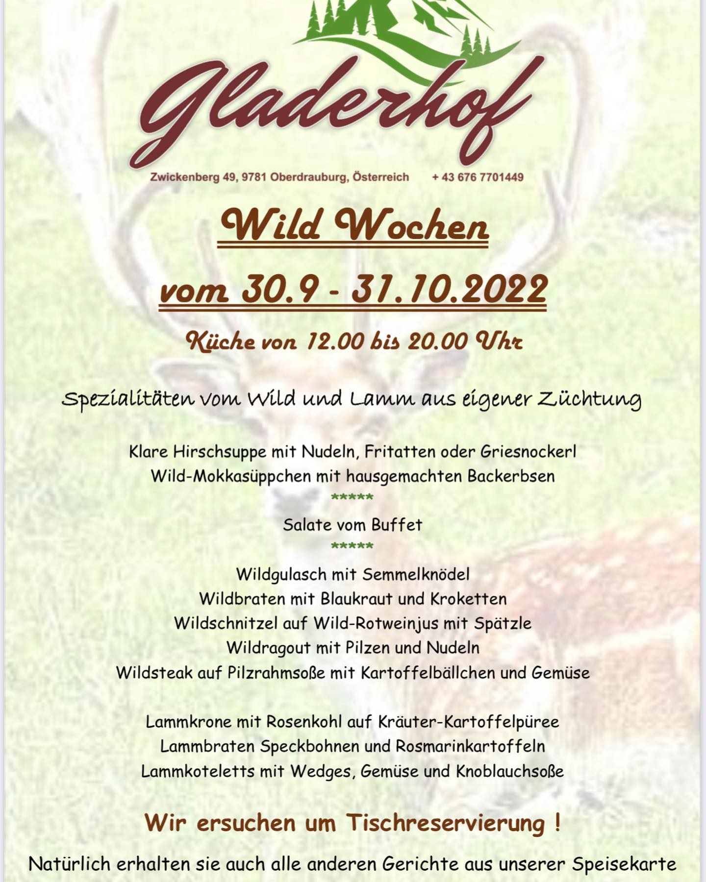 Im Restaurant werden in dieser Zeit fabelhafte Wild-Menüs serviert: Hirschsuppe, Wildgulasch, Wildragout und Wildsteak. Auch exzellente Lamm-Gerichte kommen in diesen Tagen auf den Teller: Lammkrone, Lammbraten und Lammkoteletts. Nicht nur im Herbst hat der Gladerhof Gutes zu bieten, sondern das ganze Jahr.