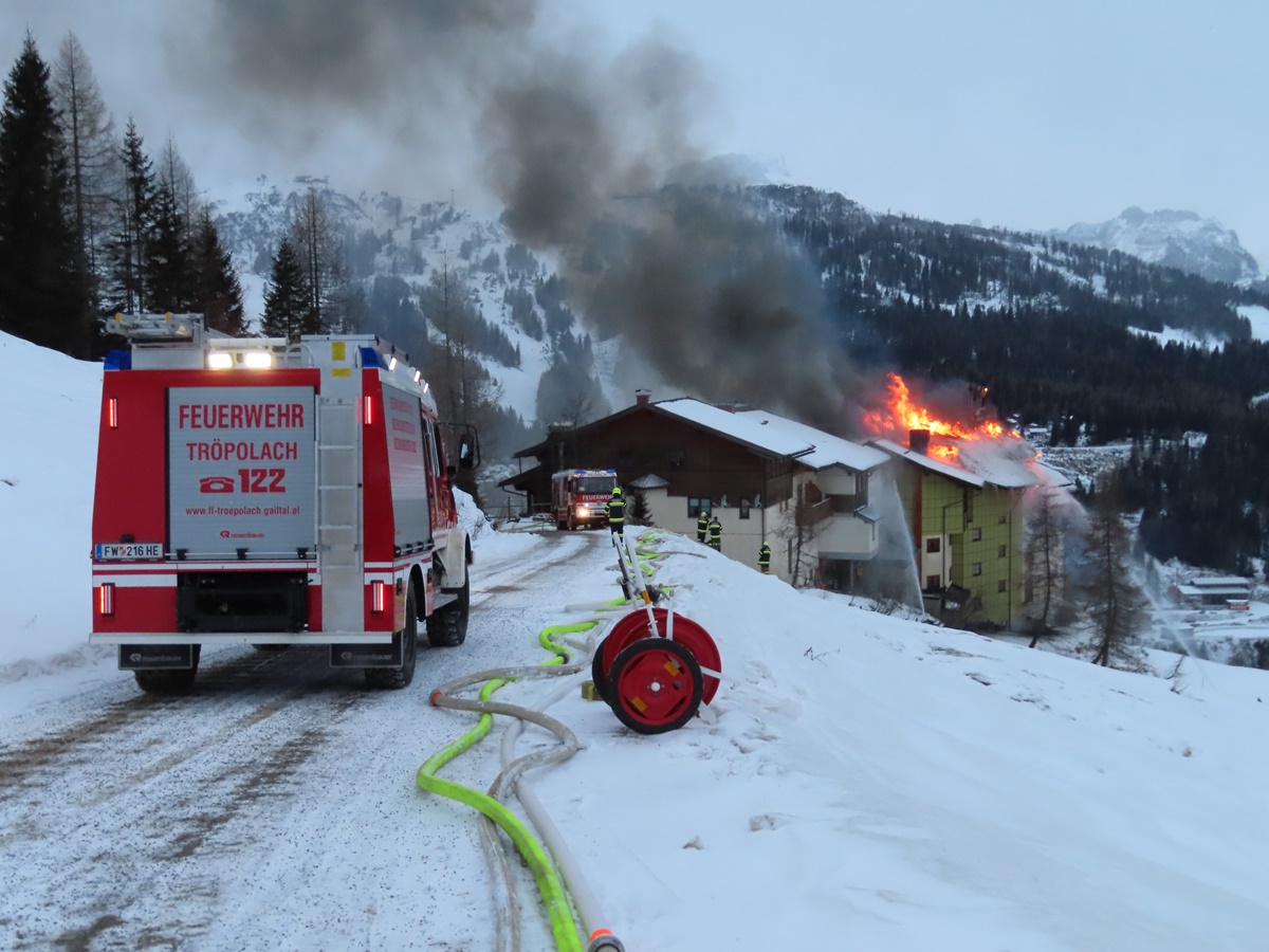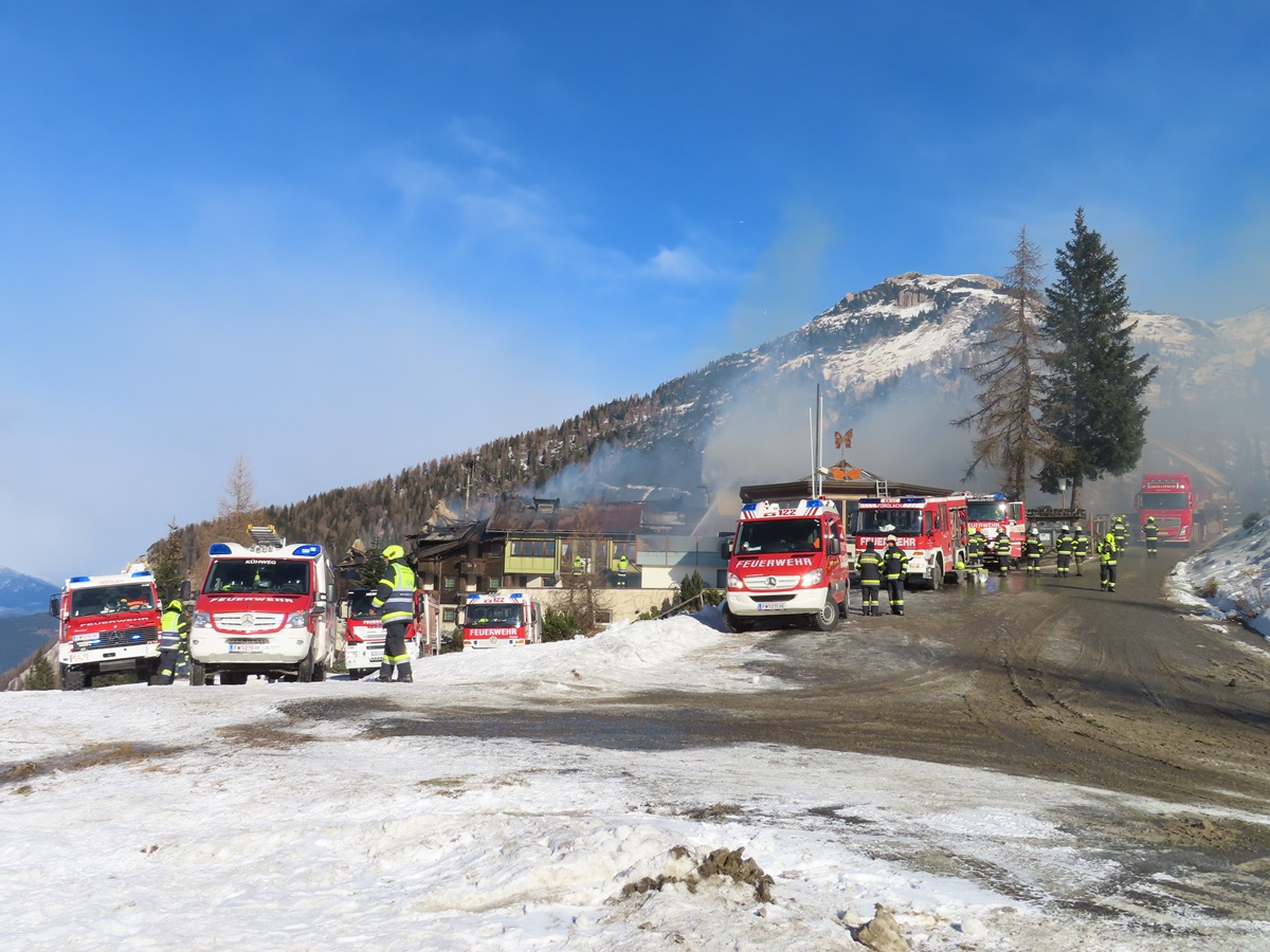 Die ersten Feuerwehren wurden um 06:45 Uhr alarmiert, nachdem ein Mitarbeiter der Bergbahnen den Brand entdeckt hatte. In weiterer Folge wurden unter der Einsatzleitung der örtlich zuständigen FF Tröpolach zahlreiche Feuerwehrkräfte aus den Bezirken Hermagor, Spittal an der Drau, Villach-Land und Villach-Stadt nachalarmiert, sodass am Nachmittag bereits 24 Feuerwehren mit rund 240 Einsatzkräften, darunter 60 Atemschutzgeräteträger, im Einsatz standen. Zwei Drehleitern und eine Teleskopmastbühne wurden in Position gebracht. Ein Rettungswagen des Roten Kreuz stand vor Ort in Bereitschaft. Die Besitzerfamilie wurde von einem Kriseninterventionsteam betreut. Brandermittler der Polizei haben noch während der Löscharbeiten mit den Ermittlungen zur Brandursache begonnen.