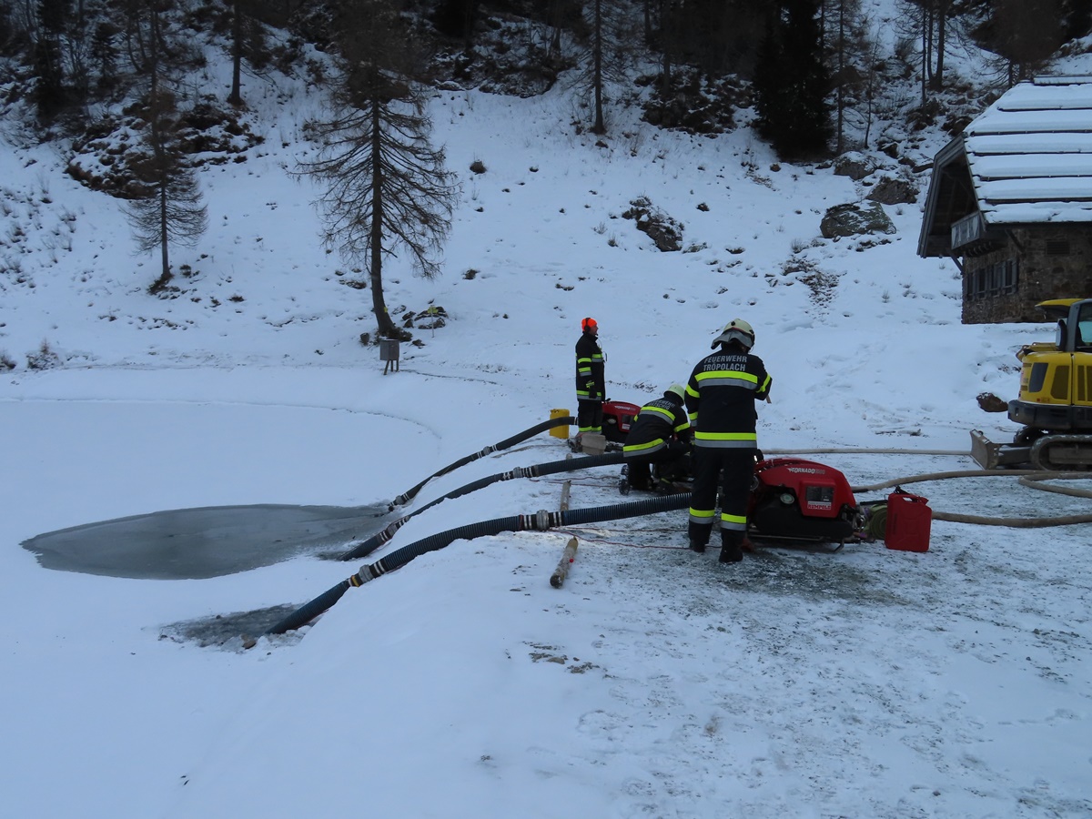 Die Wasserversorgung wurde über das Beschneiungssystem des Schigebietes Nassfeld und den rund 250 Meter entfernten Watschiger Almsee sichergestellt. Sieben Zubringerleitungen wurden zum Brandort verlegt, welche pro Minute insgesamt rund 1.000 Liter Löschwasser fördern konnten. Die alpinen Wetterverhältnisse erschwerten die Löscharbeiten und forderten die Einsatzkräfte und ihre Ausrüstung. Der starke Nordwind fachte die Flammen immer wieder an und die Minustemperaturen ließen das Löschwasser und die Schläuche gefrieren, was auch zu Schäden an Geräten und Ausrüstung führte. Um die Gefahr durch Glatteis zu minimieren, musste regelmäßig Salz gestreut werden. Die bereits in der Wintersperre befindliche Zufahrtsstraße wurde vom Bauhof der Gemeinde Hermagor mehrmals gestreut.