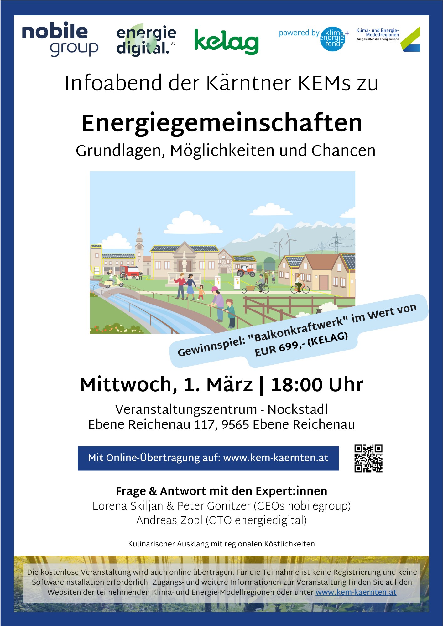 Hermagor, KEM Tourismus „Natürlich Wir“ Am 1. März 2023 um 18:00 Uhr gibt es eine Fortsetzung der erfolgreichen Veranstaltungsreihe der Kärntner Klima- und Energie-Modellregionen (KEM). Die zehnte Veranstaltung widmet sich dem zukunftsträchtigen Thema “Energiegemeinschaften”. Die Teilnahme ist sowohl online als auch live im Nockstadl der Gemeinde Reichenau möglich.