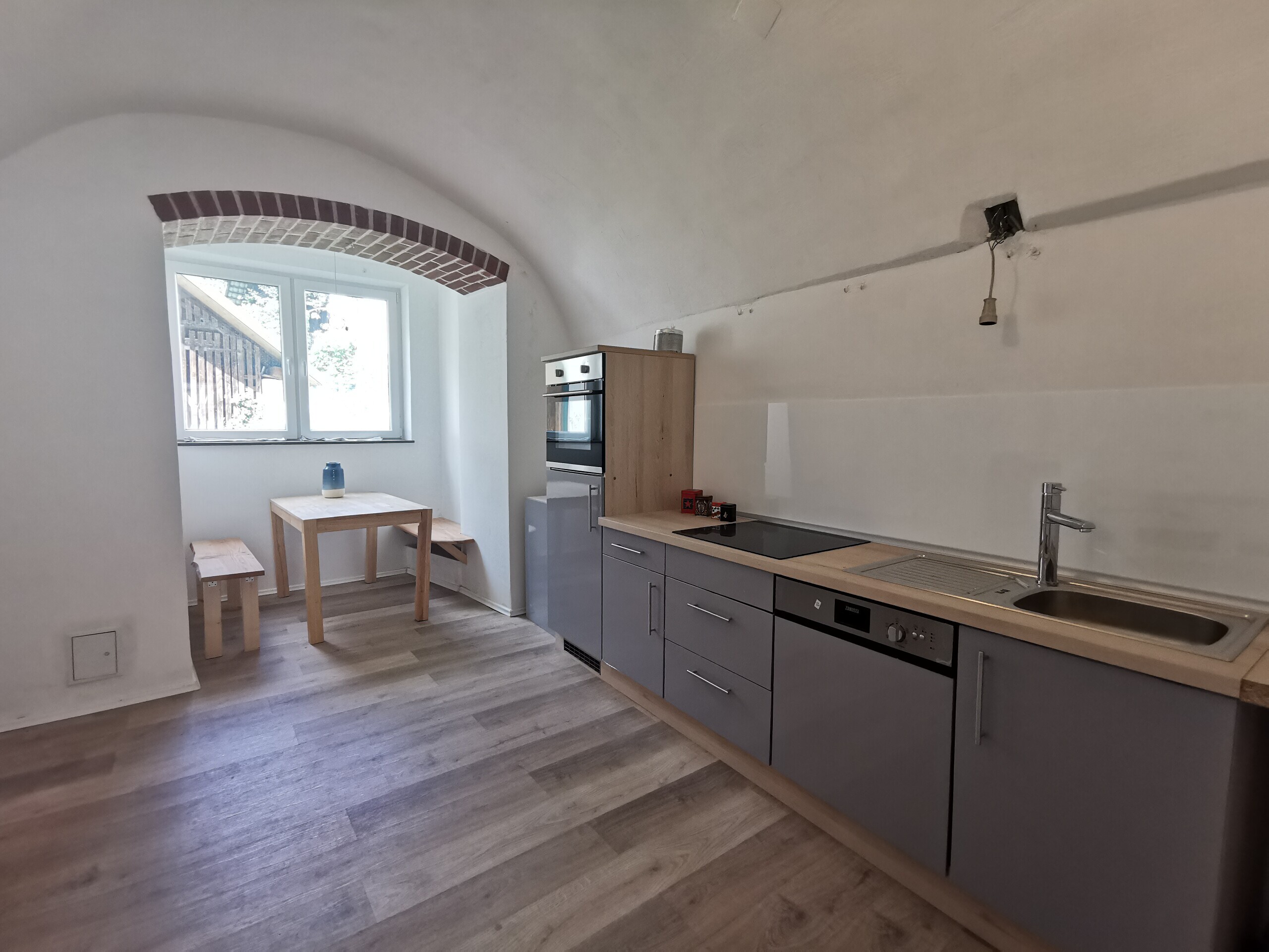 Vorraum, Wohnzimmer, Badezimmer mit Dusche, Küche mit Gewölbe, Schlafzimmer