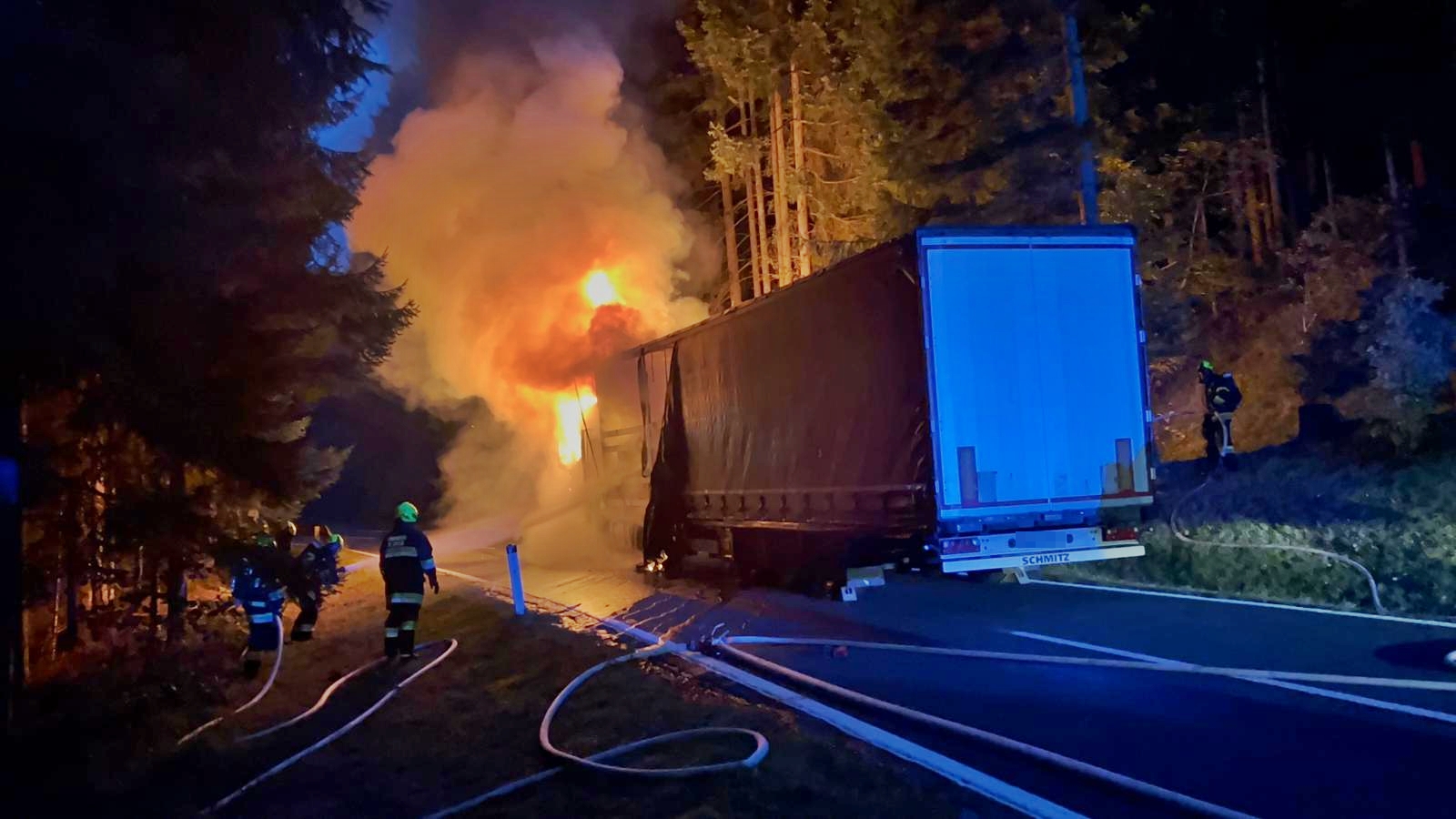 Beim Eintreffen der ersten Einsatzkräfte stand das Zugfahrzeug und ein Teil des Sattelaufliegers bereits in Vollbrand. Durch das rasche Eingreifen mehrerer Trupps unter schwerem Atemschutz konnte die Brandausbreitung auf den restlichen Sattelauflieger und den angrenzenden Wald verhindert werden.