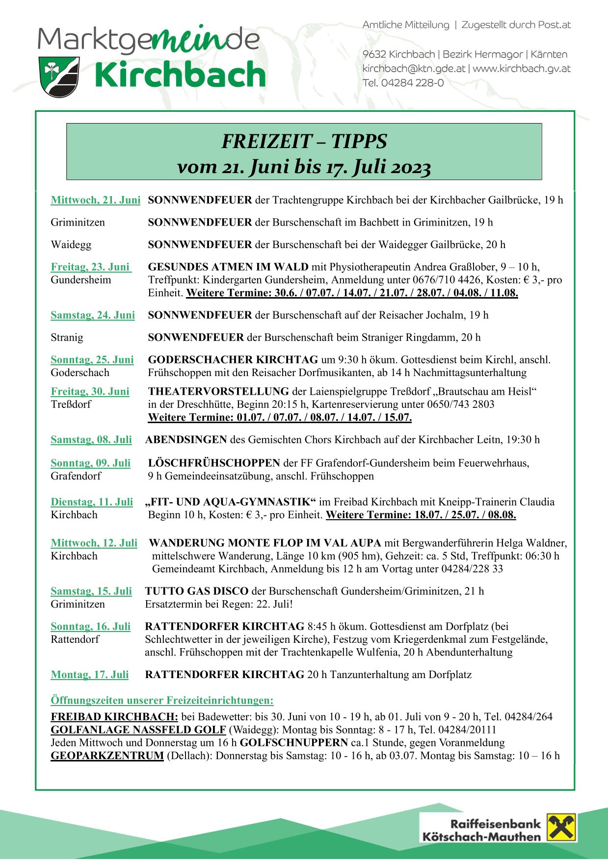 FREIBAD KIRCHBACH: bei Badewetter: bis 30. Juni von 10 – 19 h, ab 01. Juli von 9 – 20 h, Tel. 04284/264