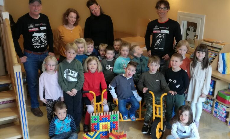 Radlwolf und Michi Kurz spendeten der integrativ geführten Schmetterlingsgruppe ein Dreirad mit Beiwagen, ein Laufrad sowie kreatives Spielzeug (ein Riesen Aximo, zwei Geo Mo, ein Lego Duplo, ein Aqua Play und ein großes Sandspielsortiment). Diese Sachen können von allen Kindern – mit oder ohne Beeinträchtigung – toll genutzt werden.