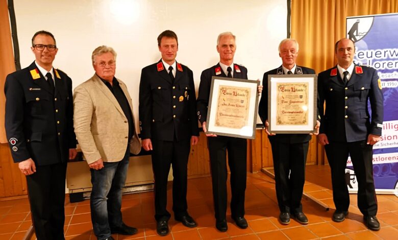 Kommandant Gerd Guggenberger konnte gemeinsam mit den Ehrengästen Bürgermeister Johann Windbichler, Vizebürgermeister Gerald Kubin, GFK-Stv. OBI Johann Huber und dem Kommandanten der Polizeiinspektion Liesing, KontrInsp. Herbert Zebedin, die Kameraden Ing. Armin Wurzer und Altbürgermeister Franz Guggenberger die Ehrendienstgrade in Würdigung ihrer langjährigen verdienstvollen Tätigkeiten für die Freiwillige Feuerwehr St. Lorenzen im Lesachtal und als Dank und Anerkennung verleihen. Ehrenhauptbrandmeister Ing. Armin Wurzer ist seit dem Jahr 1982 Gruppen- und Zugskommandant und war 18 Jahre lang Kommandant-Stellvertreter der tüchtigen Wehr. Altbürgermeister und Ehrenhautpverwalter Franz Guggenberger hat die Funktion des Kameradschaftsführers 18 Jahre lang vorbildlich ausgeübt. Beide Geehrten sind neben weiteren Funktionen seit dem Jahr 1982 im Ausschuss der Ortsfeuerwehr tätig.
