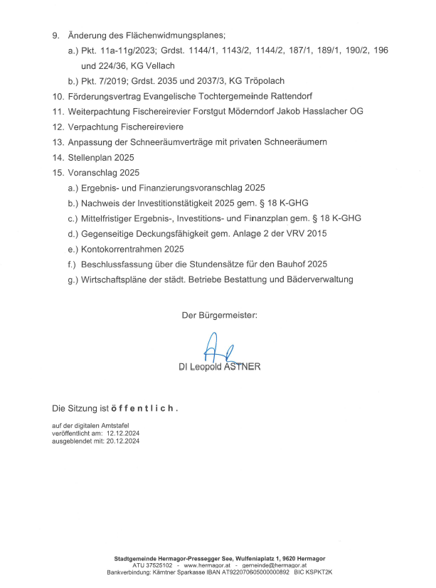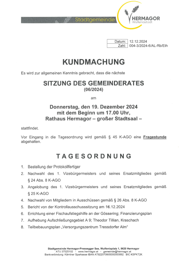 Wann: Donnerstag, 19. Dezember 2024, ab 17:00 Uhr Wo: Rathaus Hermagor, großer Stadtsaal Kundmachung, Sitzung Gemeinderat Kundmachung, Sitzung Gemeinderat KM GR 19.12.2024Herunterladen