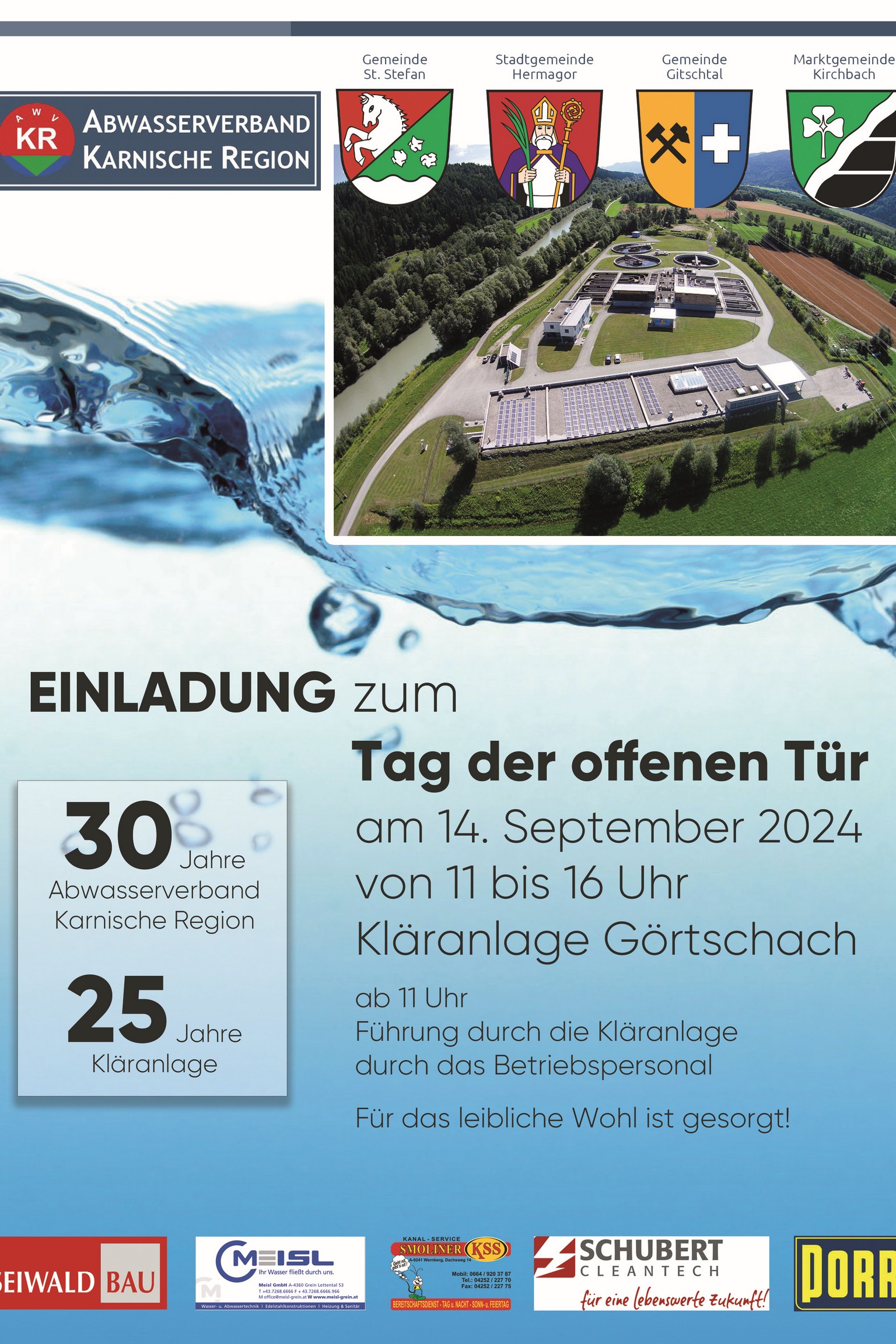 Am 14. September 2024 lädt der Abwasserverband Karnische Region anlässlich seines 30-jährigen Jubiläums und dem 25-jährigen Bestehen der Kläranlage Görrtschach herzlich zum Tag der offenen Tür ein. Von 11 bis 16 Uhr haben Besucher die Möglichkeit, einen spannenden Blick hinter die Kulissen der Kläranlage zu werfen.