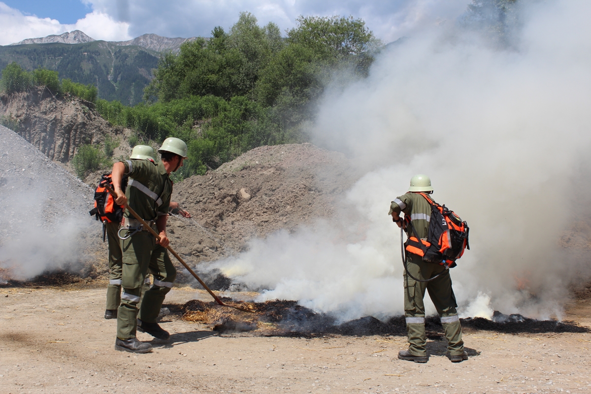 Eduard Engl jun. und Steve Kristler von der FF Kötschach-Mauthen brachten bei der ersten Station die Brandbekämpfung mittels Rückenspritze, Feuerpatsche und Kulturhaue näher. Dies wurde praxisnah mit echtem Feuer beübt. Dadurch konnten die Teilnehmerinnen und Teilnehmer feststellen, wie effektiv und erfolgreich man gegen Vegetationsbrände mit wenig Wasser – eine Rückenspritze fasst circa 25 Liter Wasser – und einfachen Hilfsmitteln sein kann.