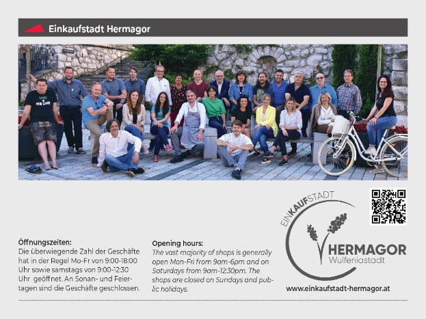 Die EinKAUFstadt wird als Gemeinschaft in dieser Broschüre ebenso auf einer halben Seite vertreten sein (Darstellungsentwurfsbeispiel siehe pdf – Einkaufstadt Hermagor). Über den QR Code wird auf unsere Homepage verwiesen, auf der alle Betriebe ersichtlich sind.