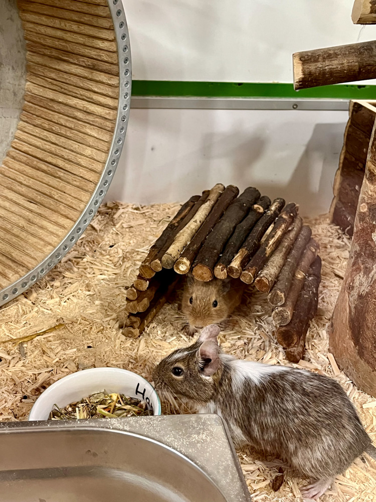 Wir sind zwei Haudegen auf der Suche nach der ultimativen Burschenbude. Worauf wir bei der Suche unseres neuen Domizils ein besonderes Knopfauge werfen, ist genug Platz zum Austollen. Außerdem muss die Wohnung über fließendes Wasser und ein Badezimmer mit Sandbecken verfügen. Das Personal wird zudem dazu aufgefordert, unseren Kühlschrank täglich mit frischem Obst und Gemüse sowie die Speisekammer mit Heu und Kräutern aufzufüllen. Von der Einrichtung her mögen wir es rustikal, sprich, nagestabil. Abwechslungsreiche Turn- und Klettermöglichkeiten sind außerdem ein „Must-have“. Ha! Das haben wir jetzt aber toll gemacht – Degufutter!!