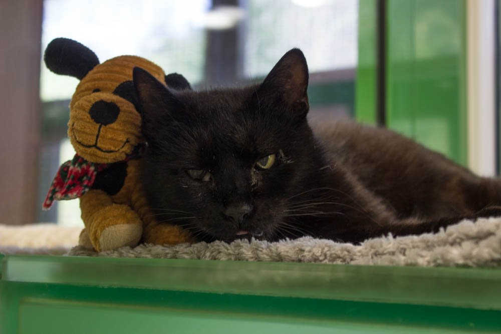 Alles ist gerade so fremd für mich – mein Mensch konnte sich nicht mehr um mich kümmern, und nun bin ich hier. Ich sehe nicht gut – auf einem Auge fast gar nichts –, deshalb verunsichern mich neue Orte und Geräusche schnell und dann pfauche ich. Aber das mache ich nicht, weil ich nicht gestreichelt werden will, sondern weil ich einfach Angst habe. Wenn ich mich sicher fühle, dann kann ich auftauen und zu einer wirklichen Schmusekatze werden.
